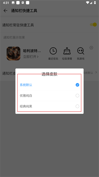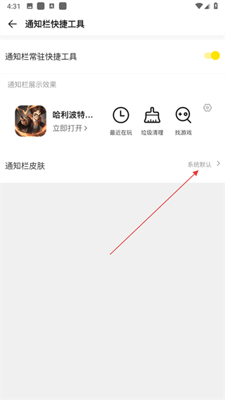 3、在通知欄快捷工具頁面里,點擊通知欄皮膚選項。