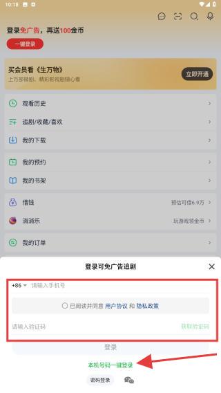3、彈窗展開后,提供兩種手機(jī)號(hào)登錄路徑:本機(jī)號(hào)碼一鍵登錄按鈕、手機(jī)號(hào)輸入框中,獲取驗(yàn)證碼,任需選擇。