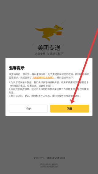 1、打開(kāi)美團(tuán)騎手應(yīng)用,彈出隱私政策提示框,點(diǎn)擊同意按鈕,接受美團(tuán)騎手隱私政策,推進(jìn)登錄流程。