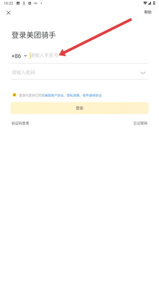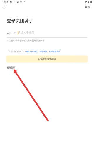 3、在密碼登錄頁(yè)面,先輸入手機(jī)號(hào)碼,再填寫(xiě)對(duì)應(yīng)密碼,完成信息錄入后,即可提交登錄美團(tuán)騎手賬號(hào)。
