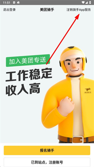 1、打開(kāi)美團(tuán)騎手APP后,點(diǎn)擊界面右上角的注銷(xiāo)騎手App服務(wù)選項(xiàng),進(jìn)入注銷(xiāo)服務(wù)頁(yè)面。