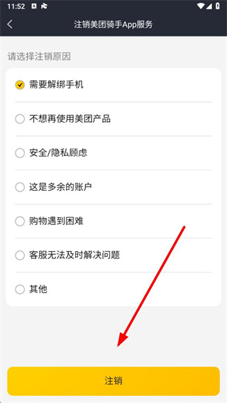 3、在注銷(xiāo)原因選擇頁(yè)面,選擇相應(yīng)的注銷(xiāo)原因后,點(diǎn)擊注銷(xiāo)按鈕,即可完成美團(tuán)騎手的注銷(xiāo)操作。