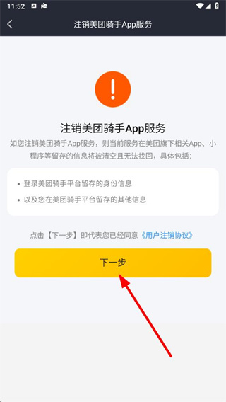 2、在注銷(xiāo)服務(wù)頁(yè)面,點(diǎn)擊下一步按鈕,進(jìn)入注銷(xiāo)原因選擇頁(yè)面。