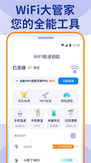 wifi大管家可以很好的幫助用戶管理自己的手機網(wǎng)絡(luò)的安全,所有用戶都是可以非常簡單的在線操作各種功能,輕松的查看更多的WiFi安全檢測的數(shù)據(jù)信息,有任何的問題也是可以及時的了解并進行清理,各種服務(wù)功能沒有付費的項目。