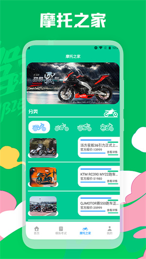 摩托車(chē)輪駕考通可以讓所有喜歡摩托車(chē)的用戶(hù)都能非常簡(jiǎn)單的學(xué)習(xí)很多的內(nèi)容,還有很多的摩托車(chē)相關(guān)的信息也是可以免費(fèi)的直接在線了解,各種摩托車(chē)的型號(hào)、性能、報(bào)價(jià)等信息更加的明確,幫助用戶(hù)可以更好的選擇合適的摩托車(chē)。