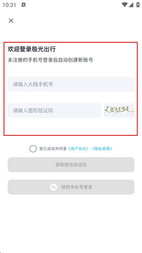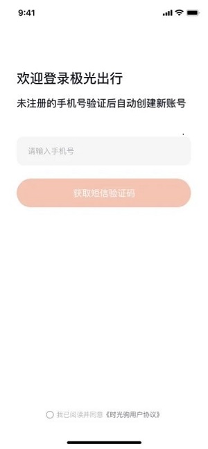 4、完成上述操作后,點(diǎn)擊獲取短信驗(yàn)證碼,輸入收到的短信驗(yàn)證碼,或者選擇授權(quán)手機(jī)號(hào)登錄,完成極光出行的登錄操作。