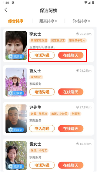 4、在保潔阿姨列表中,選擇合適的阿姨,點(diǎn)擊電話溝通或在線聊天進(jìn)行咨詢并下單。