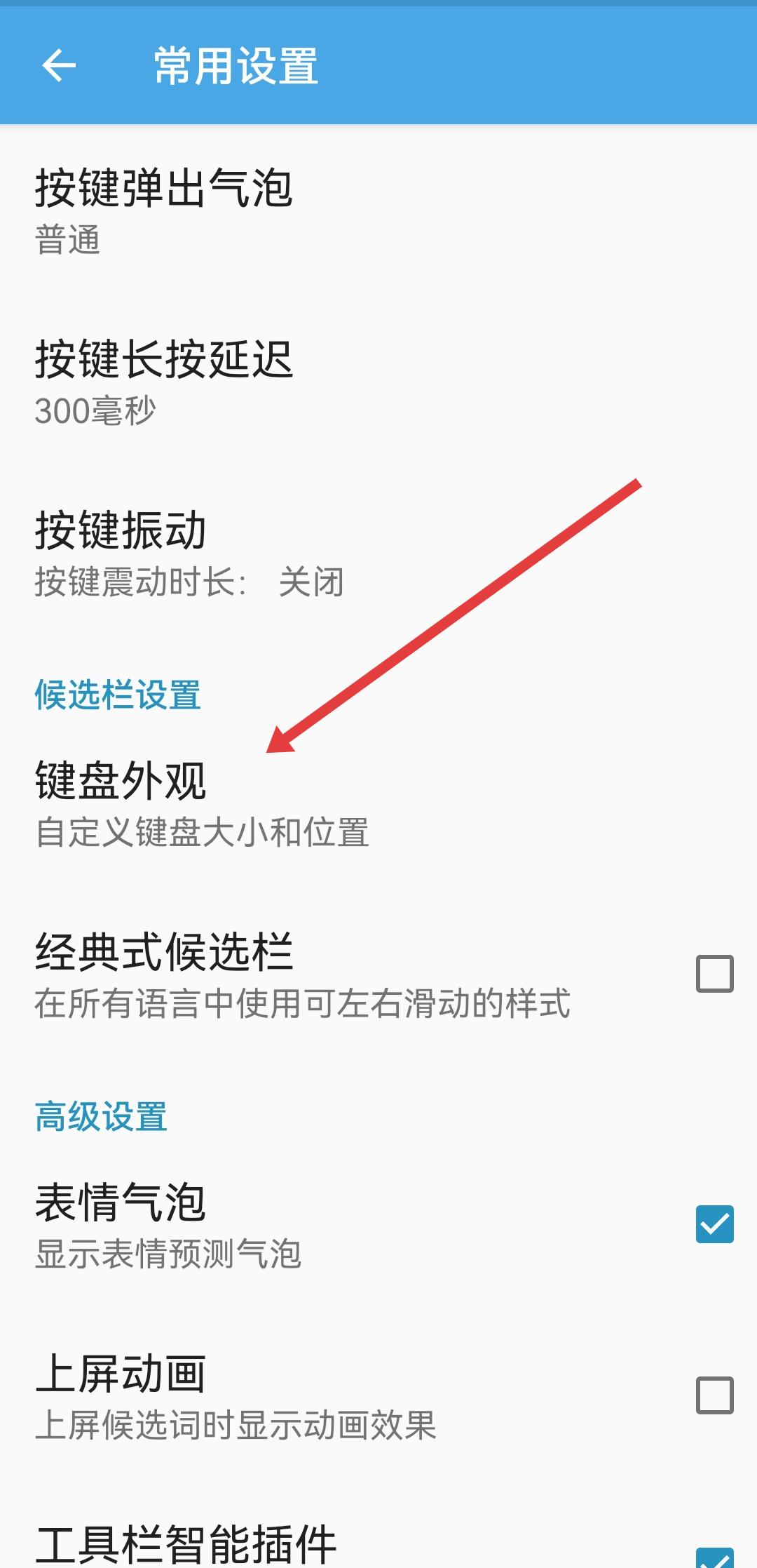 3、在常用設(shè)置界面,點(diǎn)擊鍵盤(pán)外觀選項(xiàng),進(jìn)入鍵盤(pán)外觀設(shè)置頁(yè)面。
