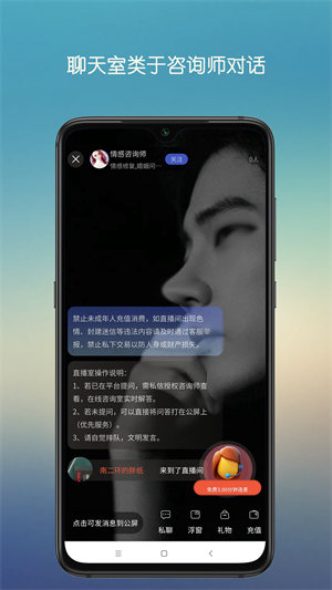 - 熱門聊天室隨時(shí)加入,觀看咨詢師的直播,可以隨時(shí)發(fā)送彈幕互動(dòng),每天都有超多咨詢室可以等你加入;