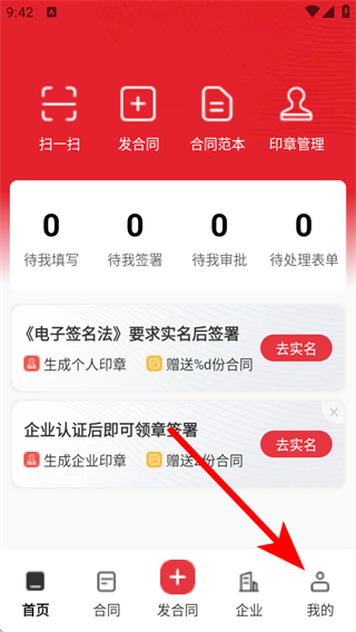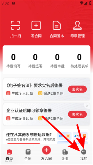 1、在e簽寶的首頁(yè),需要點(diǎn)擊底部我的按鈕,進(jìn)入個(gè)人頁(yè)面。