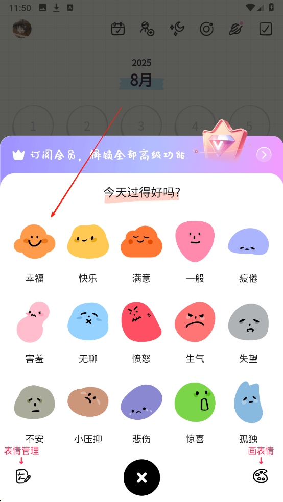 1、打開日記本,在彈出的今天過得好嗎的表情選擇界面,點擊代表幸福的橙色笑臉表情,進入日記編輯頁面。