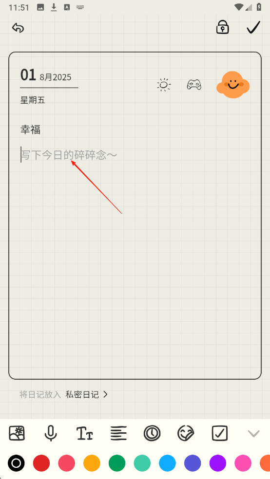 2、在日記編輯頁面,找到寫下今日的碎碎念輸入框,點擊該輸入框,準備輸入當天的心情感悟或生活瑣事等內(nèi)容。