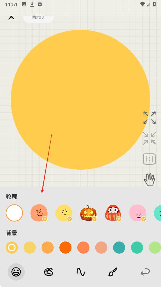 3、點擊頁面下方的畫表情圖標,進入表情繪制界面,在“輪廓”選項中選擇喜歡的輪廓樣式,再從背景顏色里挑選合適的顏色,進行表情創(chuàng)作。