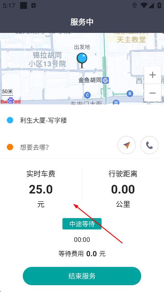 3、完成相關(guān)信息填寫后,點擊“確認創(chuàng)單”按鈕,進入服務(wù)中頁面,此時可查看實時車費、行駛距離等信息,服務(wù)結(jié)束后點擊“結(jié)束服務(wù)”即可。