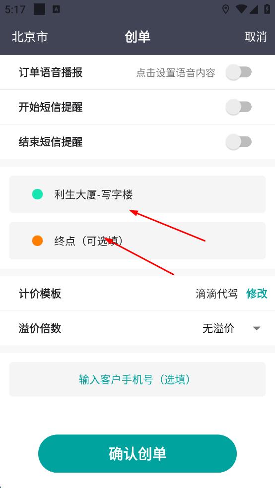 2、在創(chuàng)單頁面,可根據(jù)需求設(shè)置訂單語音播報、短信提醒等功能,然后填寫出發(fā)地,若有需要也可填寫終點,接著確認計價模板等信息。