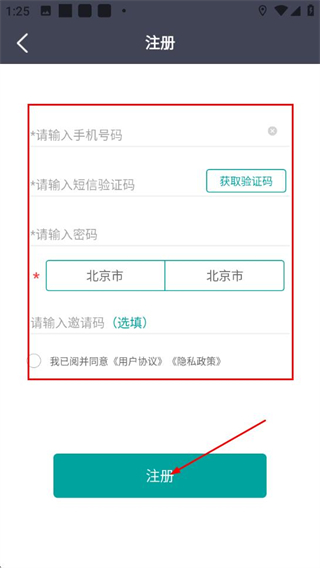 3、在輸入手機號碼、短信驗證碼、密碼,選擇所在城市,勾選同意協(xié)議,點擊注冊。