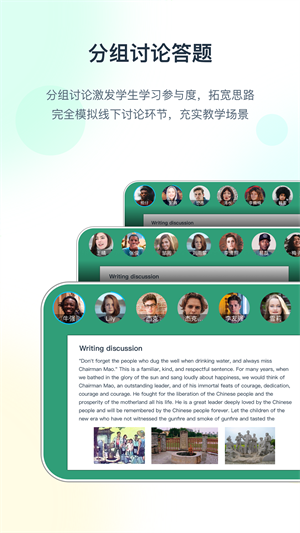 - 對所有的學(xué)生進行分組討論答題,激發(fā)學(xué)生的學(xué)習(xí)參與度,拓寬思路,完美模擬線下討論環(huán)節(jié)、場景;