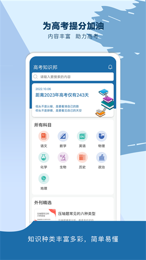 高考知識邦是一款專為高考打造的學(xué)習(xí)復(fù)習(xí)軟件,每個高考生都可以在線學(xué)習(xí),語文、數(shù)學(xué)、英語、物理、滑雪、生物、歷史、政治、地理等就九大科目的知識點分類詳解,自由選擇刷題提高自己的成績,讓考試分數(shù)大大提升,更大幾率通過高考。