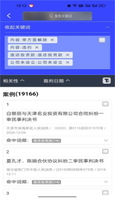 3、可以通過選擇案件內(nèi)容條件,找尋用戶所關注的官司案件。