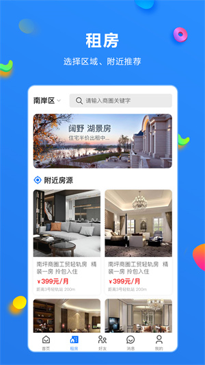 - 輸入地點(diǎn)、小區(qū)名等關(guān)鍵字,找到最新、距離最近的房源信息給大家選擇,在線瀏覽,隨時(shí)和房東溝通;