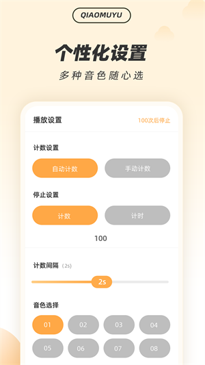 - 擁有自動、手動模式,豐富的音色可選擇,開啟自動模式還有計(jì)數(shù)間隔、停止時長等內(nèi)容的設(shè)置。