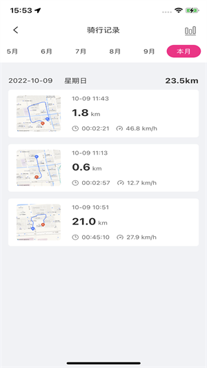 - 每一次騎行出行都會有對應的騎行記錄可查看,看到自己的騎行路線、總里程、耗時、平均速度等信息;