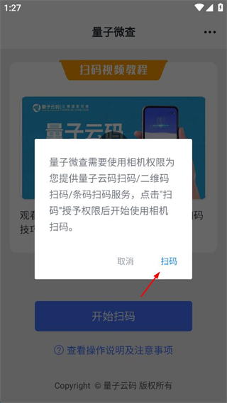 2、點擊“開始掃碼”按鈕,進入掃碼權限申請界面。