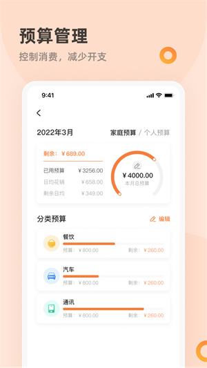 - 幫助用戶合理控制消費(fèi)預(yù)算支出,為家庭及個(gè)人財(cái)務(wù)管理、資產(chǎn)增值創(chuàng)造良好基礎(chǔ),也可以了解各種記賬功能。