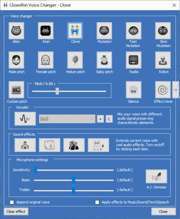 Clownfish Voice Changer小丑魚變聲器軟件是一款可以改變用戶聲音的軟件,非常流行的惡搞軟件,可以通過軟件把我們的聲音設(shè)置成為想要的音色,會(huì)有實(shí)時(shí)的翻譯轉(zhuǎn)換過程,讓我們可以無縫的進(jìn)行溝通和聊天。