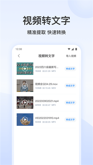 2、【導(dǎo)入音頻轉(zhuǎn)文字】支持將保存在手機(jī)中、同事、同學(xué)或好友通過微信、QQ、企業(yè)微信、釘釘發(fā)來的語音、音頻文件轉(zhuǎn)換為文字,轉(zhuǎn)換過程快速,轉(zhuǎn)換結(jié)果準(zhǔn)確,轉(zhuǎn)換后可保存、導(dǎo)出分享;
