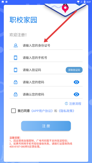 3、在進(jìn)入到職校家園注冊頁面中后,按照輸入框要求依次輸入信息完成注冊操作。