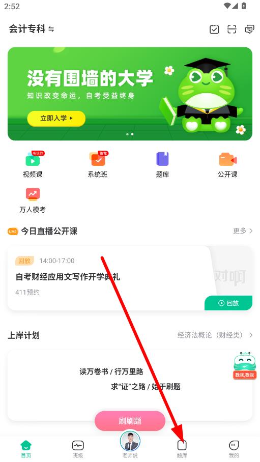 1、在對啊課堂首頁,點擊底部導航欄中的題庫選項,進入題庫界面。