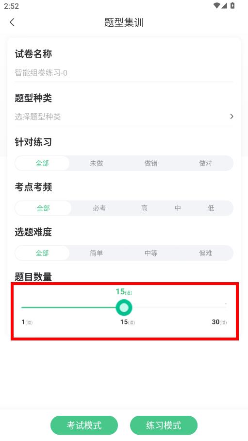 3、在題型集訓設置頁面中,找到題目數(shù)量調節(jié)欄,通過滑動進度條來設置想要的做題數(shù)量。