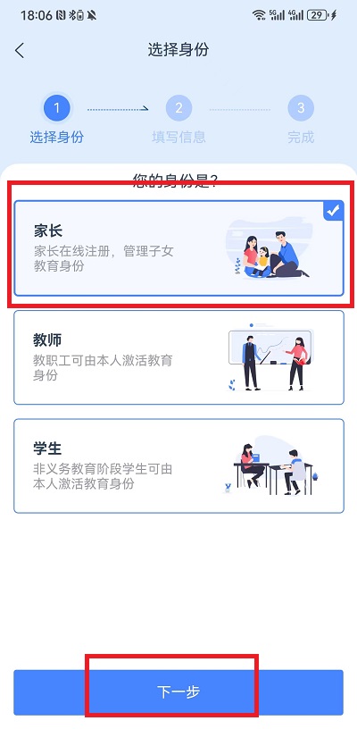 3、注冊頁面中會有三個(gè)身份可以選擇,用戶需要針對自己的身份去進(jìn)行注冊,以下示例為【家長】,選擇好后點(diǎn)擊下一步;