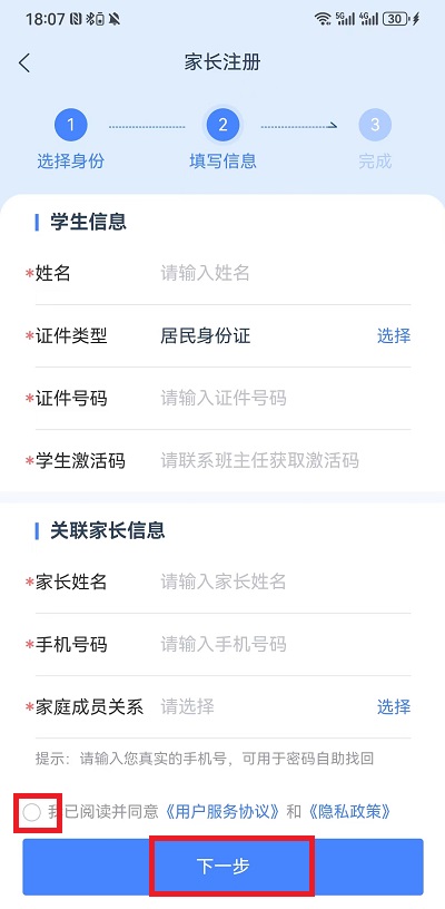 4、用戶需要認(rèn)真的填寫所有的信息,不可以填寫錯(cuò)信息,填寫完成之后需要獲得【學(xué)生激活碼】,這個(gè)是需要班主任給家長的,填寫完成之后就可以點(diǎn)擊下一步即可完成注冊;