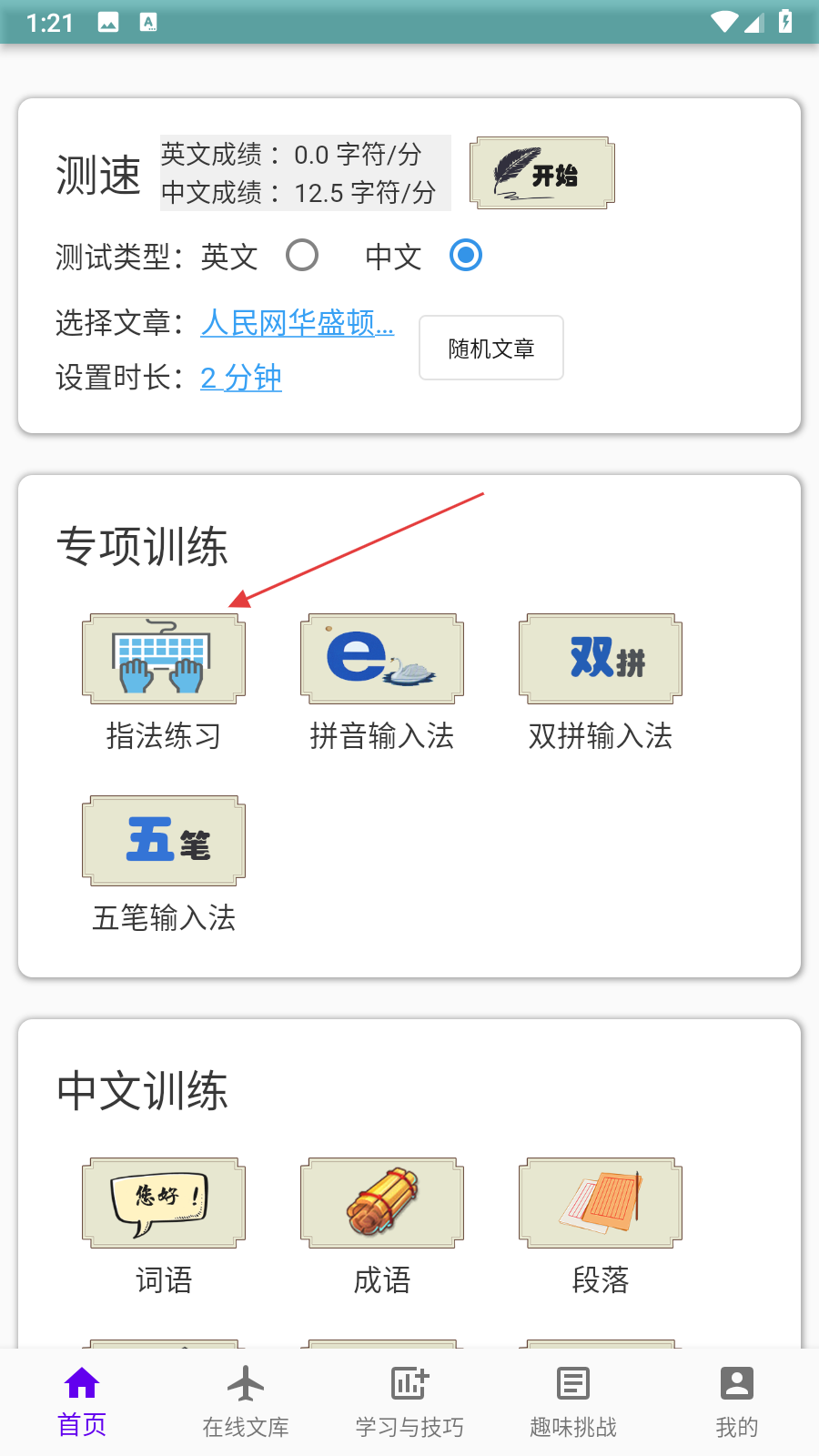 1、打開只語打字訓(xùn)練APP,在首頁專項訓(xùn)練板塊中,點擊指法練習(xí)選項。