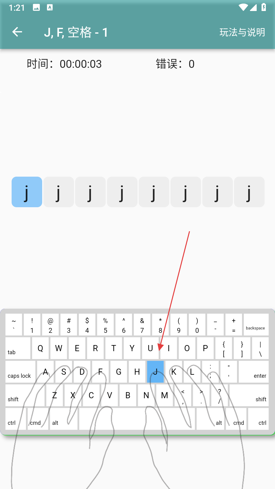 4、按照界面中顯示的正確指法示意圖,進(jìn)行按鍵練習(xí),系統(tǒng)會實時展示時間、錯誤數(shù)等數(shù)據(jù)。