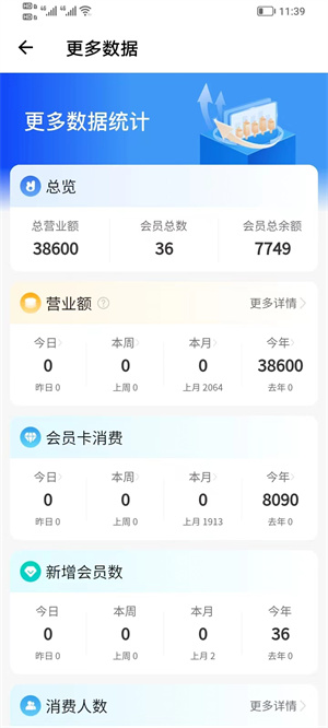- 實時統(tǒng)計每天、每月營業(yè)額、會員增長數(shù)等各種數(shù)據(jù),方便用戶可以更直觀的在線了解信息;