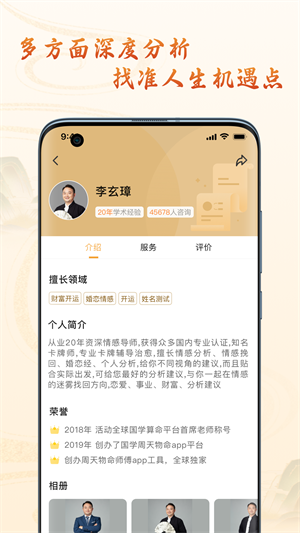 周天物命找到國(guó)內(nèi)外著名的國(guó)學(xué)老師,與老師一起暢聊國(guó)學(xué)精髓,解開(kāi)心中疑慮,可以得到匹配、感覺(jué)、友誼等指標(biāo),以及相應(yīng)的命運(yùn)分析和注意事項(xiàng)。