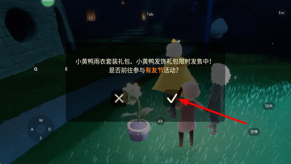 1、當(dāng)游戲彈出“小黃鴨雨衣套裝禮包、小黃鴨發(fā)飾禮包限時(shí)發(fā)售中!是否前往參與有友節(jié)活動(dòng)?”提示時(shí),點(diǎn)擊√按鈕進(jìn)入活動(dòng)界面。