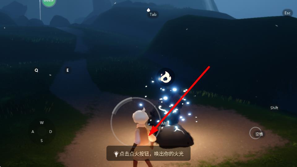 3、當出現(xiàn)點擊點火按鈕,喚出你的火光提示時,點擊對應交互按鈕,用角色蠟燭火光驅(qū)散黑暗,完成點火操作。