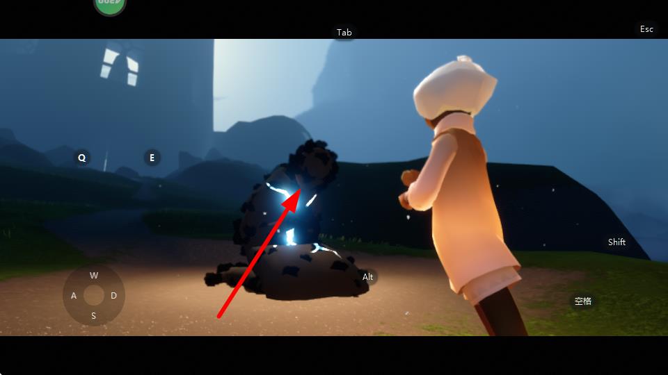 2、找到被黑暗包裹、帶有藍光的先祖或目標物體,靠近后,能看到藍光閃爍處,這就是要點火互動的關鍵位置。