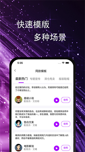 - 每天更新更多優(yōu)質(zhì)素材,再加上便捷的配音功能,讓你輕松獲得專屬的聲音杰作;
