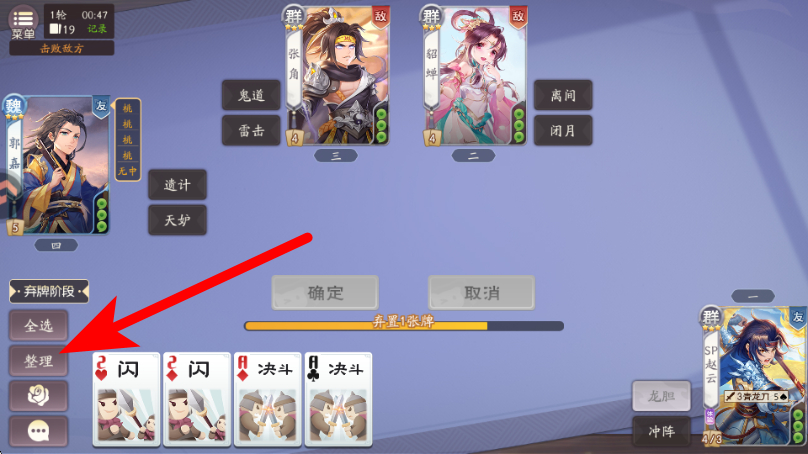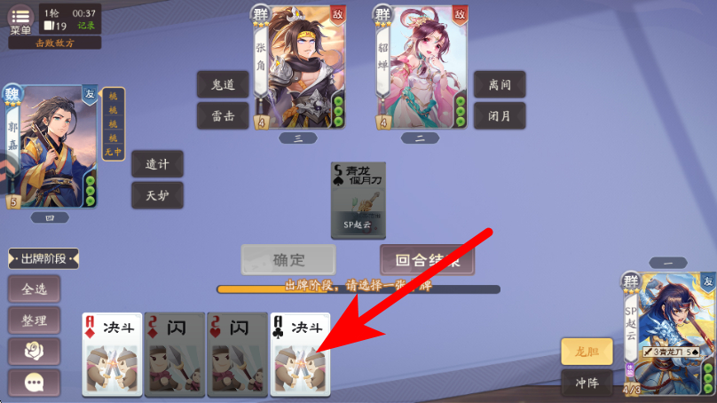 4、根據(jù)局勢點(diǎn)擊整理,利用卡牌組合和武將技能,擊敗敵方角色。