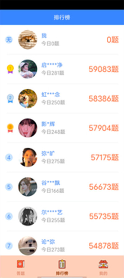 3、軟件還提供答題榜單,每個(gè)人的答題數(shù)都會(huì)進(jìn)入排行榜,關(guān)注自己的成績(jī),看看其他用戶的答題記錄。