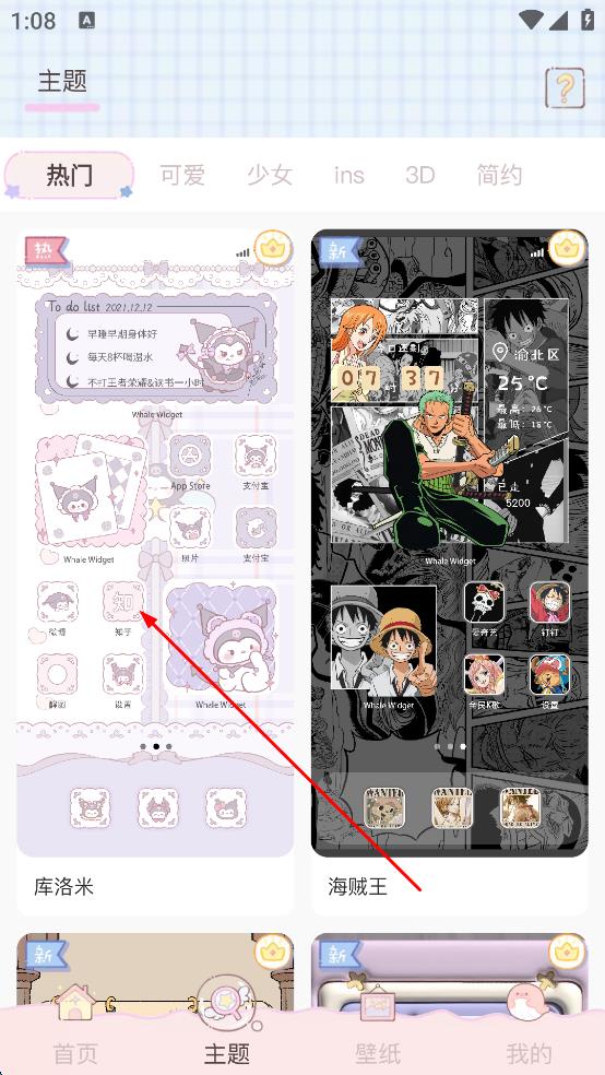 1、打開(kāi)主題軟件,進(jìn)入主界面后,點(diǎn)擊底部“主題”選項(xiàng),進(jìn)入主題選擇頁(yè)面,在眾多主題中找到喜歡的主題所在區(qū)域。