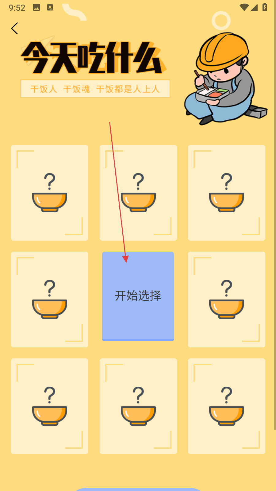 3、進(jìn)入餐品選擇界面,界面會(huì)展示多個(gè)帶問號(hào)的餐品選項(xiàng)框以及開始選擇按鈕。