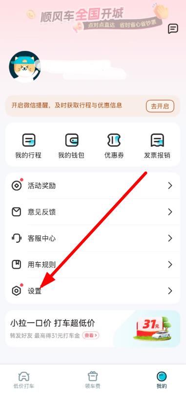 1、打開小拉出行APP進入我的界面,點擊下方設(shè)置選項。