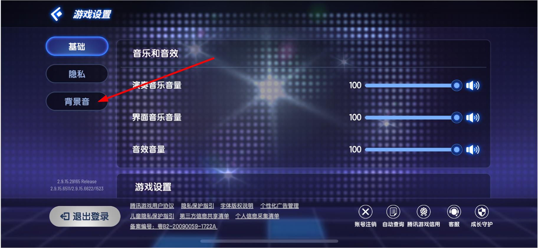 3.進(jìn)入游戲設(shè)置界面后,點(diǎn)擊左側(cè)列表中的背景音選項(xiàng)。