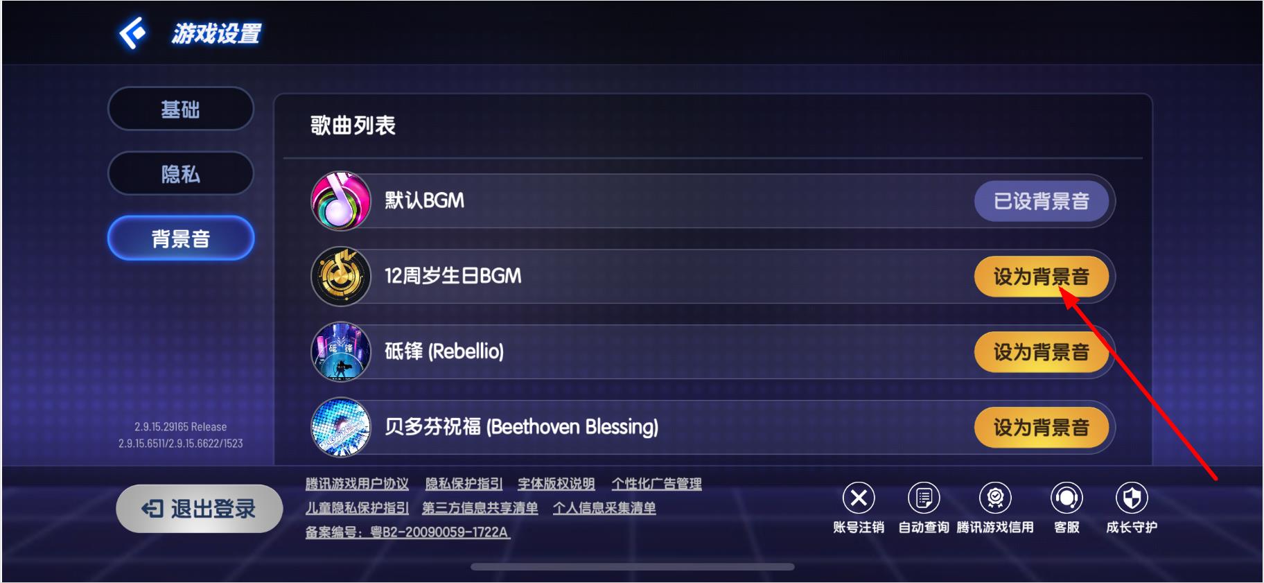 4.在右側(cè)歌曲列表中,選擇想要設(shè)置為背景音樂(lè)的歌曲,點(diǎn)擊其右側(cè)的設(shè)為背景音按鈕,即可完成背景音樂(lè)的設(shè)置。